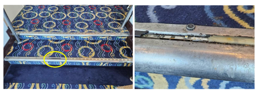 Paton claims that the worn condition of the nosing was not visible or marked and that the hazard was not open and obvious to passengers. It was her first time in that specific area of the ship. She asserts that only after the fall did she realize the step was defective. The incident was promptly reported to ship personnel, and Royal Caribbean documented the scene and her injuries.